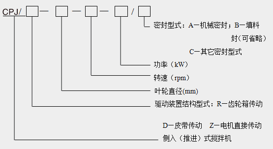 CJJ型號(hào)標(biāo)記及示例: CJJ:側(cè)入式攪拌機(jī)型號(hào) T:軸封型式代號(hào)(填料密封注T,機(jī)械密封注M) S1:接液部位材料代號(hào) |