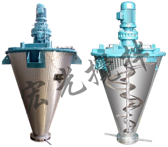 單錐雙螺旋錐形混合機,它由傳動部分、筒蓋、螺旋、筒體、出料閥等組成。